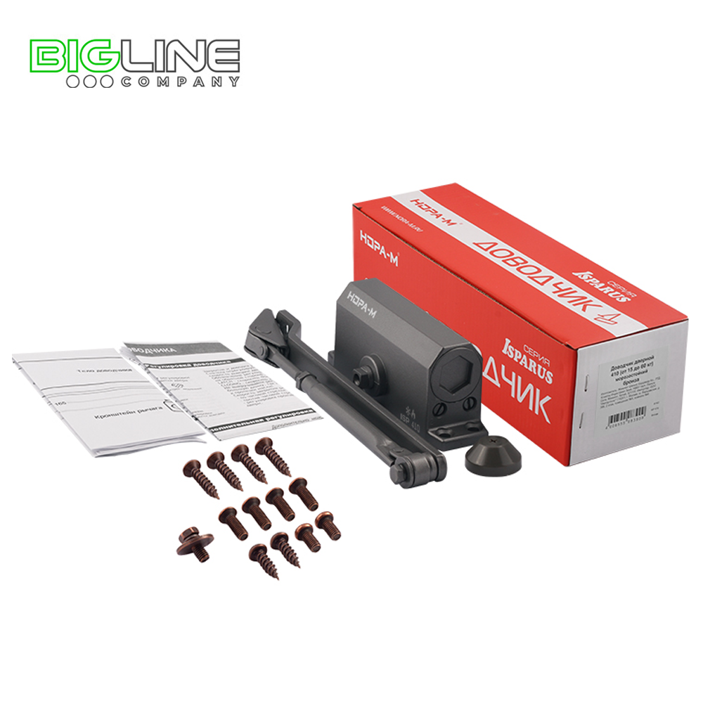 Корпус доводчика выполнен из силумина толщиной не менее 3,7 мм, детали внутреннего механизма - из закаленной стали. Доводчик универсален в использовании, его можно ставить как внутри помещения, так и на улице. В комплекте 2 вида крепежа, для установки на деревянные/пластиковые, либо на металлические двери. Полноразмерный шаблон для установки также в комплекте. Угол открытия двери зависит от установки доводчика. Если корпус доводчика установлен на дверной короб, то угол открытия будет максимальным - до 180 градусов. Если корпус доводчика установлен на дверное полотно, то угол открытия зависит от места установки относительно петель - чем дальше доводчик от петель, тем меньше угол открытия.
