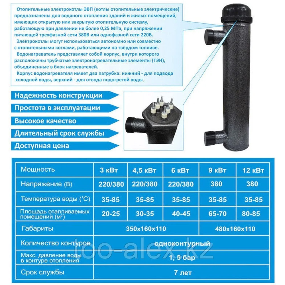 Электрокотел ЭВП - 6 кВт способен обеспечить комфортные температурные условия в помещении площадью 40-45 квадратных метров. Прибор представляет собой корпус, внутри которого расположены трубчатые электронагревательные элементы (ТЭН), объединенные в блок нагревателей.
