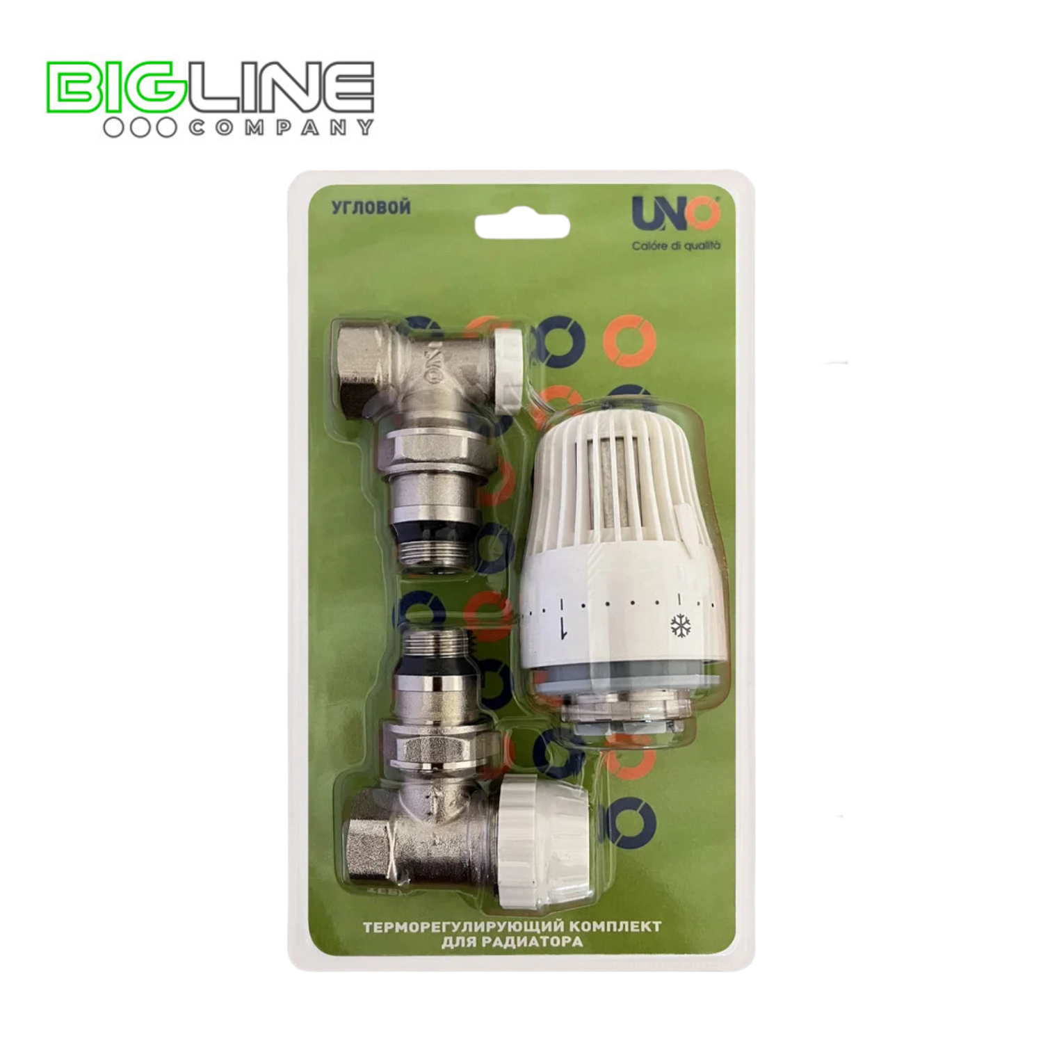 Комплект терморегулирующий угловой UNO 3/4 включает в себя термостатический и запорно-регулировочный радиаторные клапаны, а также термостатическую головку. Набор предназначен для бокового подключения прибора водяного отопления, а так же автоматического регулирования расхода теплоносителя в зависимости от температуры воздуха в помещении.
