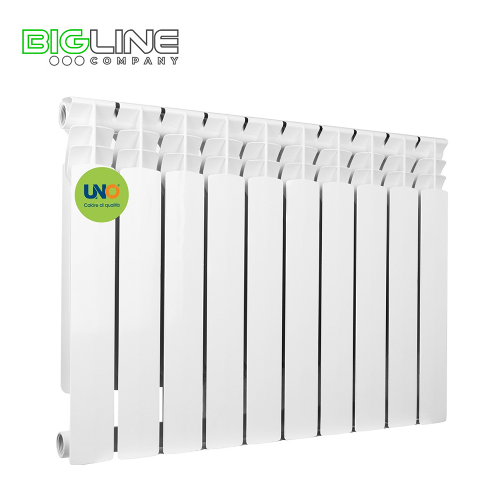 Радиаторы отопления UNO BRUNO 500/80 предназначены для применения в качестве отопительных приборов в системах водяного отопления жилых и общественных зданий. Радиаторы могут использоваться как для автономных систем отопления, так и для систем центрального отопления, в том числе многоэтажных высотных зданий. Каждая секция радиатора имеет два стальных горизонтальных коллектора, соединенных между собой вертикальной стальной трубкой. В целях повышения теплоотдачи, предварительно спаянные стальные трубки (стальной сердечник) сверху заливают алюминиевым сплавом методом литья под давлением в заранее приготовленные формы. Благодаря стальному сердечнику теплоноситель (вода, антифриз) не имеет контакта с алюминиевой поверхностью. Поэтому этот прибор более пригоден для применения в отопительных системах с плохим качеством теплоносителя (PH 810), что непозволительно для простых алюминиевых радиаторов.