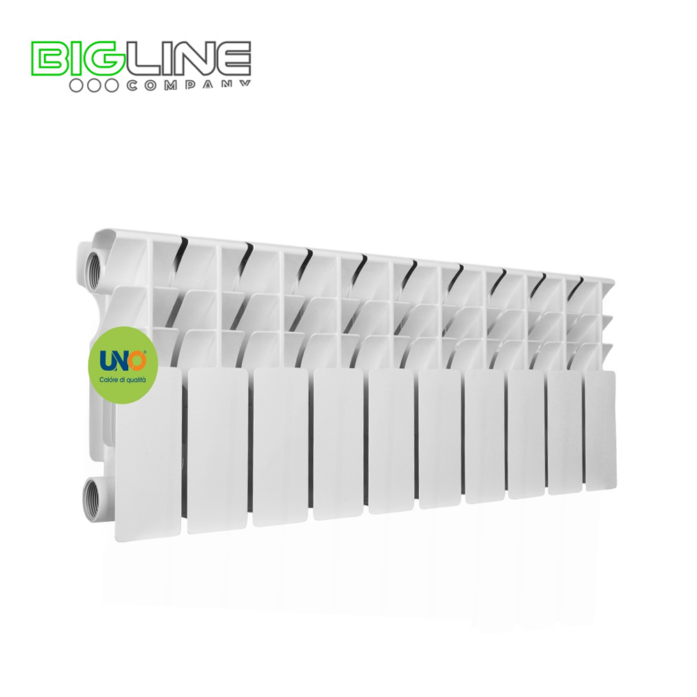 Радиаторы отопления UNO CENTO 200/100 предназначены для применения в качестве отопительных приборов в системах водяного отопления жилых и общественных зданий. Радиаторы могут использоваться как для автономных систем отопления, так и для систем центрального отопления, в том числе многоэтажных высотных зданий. Каждая секция радиатора имеет два стальных горизонтальных коллектора, соединенных между собой вертикальной стальной трубкой. В целях повышения теплоотдачи, предварительно спаянные стальные трубки (стальной сердечник) сверху заливают алюминиевым сплавом методом литья под давлением в заранее приготовленные формы. Благодаря стальному сердечнику теплоноситель (вода, антифриз) не имеет контакта с алюминиевой поверхностью. Поэтому этот прибор более пригоден для применения в отопительных системах с плохим качеством теплоносителя (PH 810), что непозволительно для простых алюминиевых радиаторов.