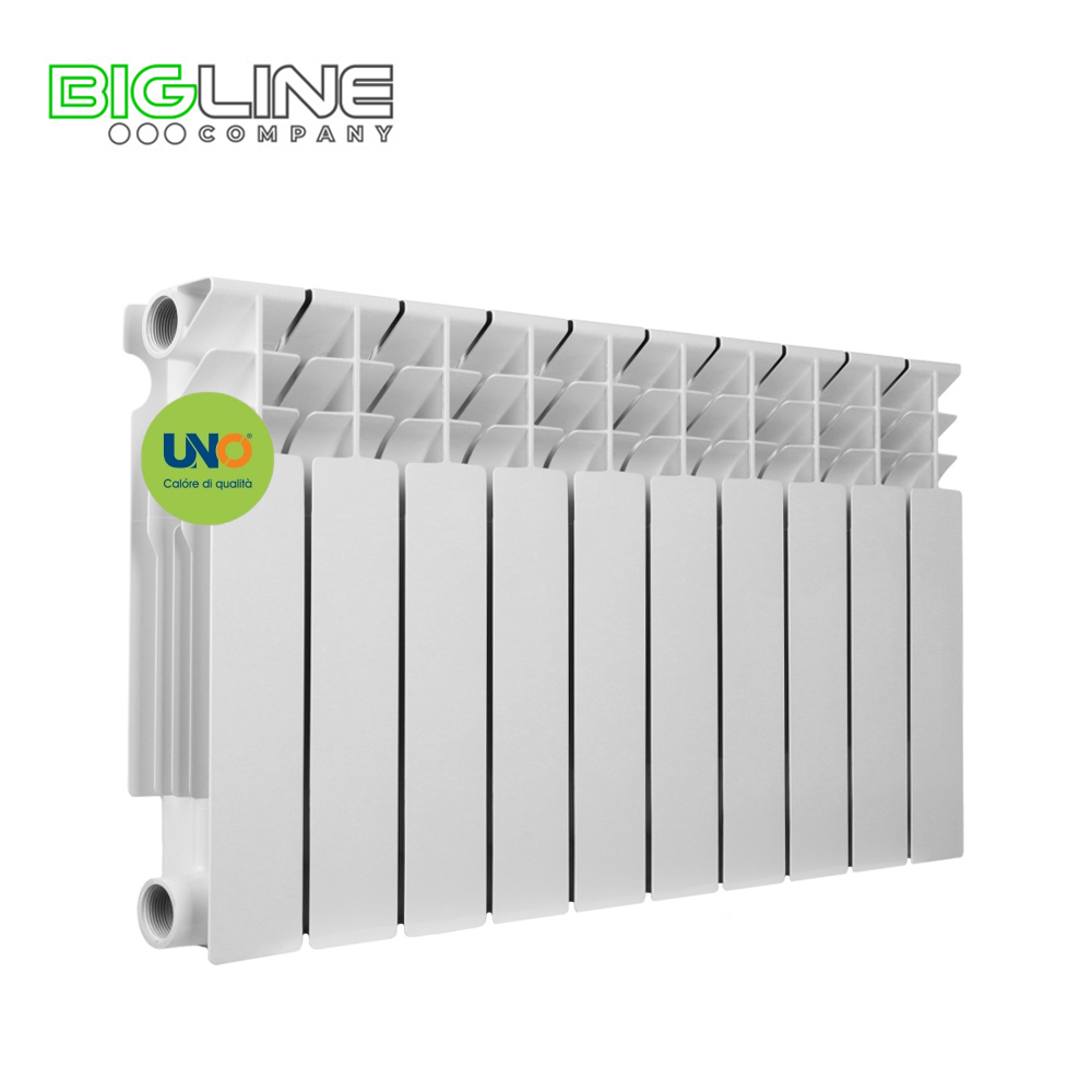 Радиаторы отопления UNO CENTO 300/100 предназначены для применения в качестве отопительных приборов в системах водяного отопления жилых и общественных зданий. Радиаторы могут использоваться как для автономных систем отопления, так и для систем центрального отопления, в том числе многоэтажных высотных зданий. Каждая секция радиатора имеет два стальных горизонтальных коллектора, соединенных между собой вертикальной стальной трубкой. В целях повышения теплоотдачи, предварительно спаянные стальные трубки (стальной сердечник) сверху заливают алюминиевым сплавом методом литья под давлением в заранее приготовленные формы. Благодаря стальному сердечнику теплоноситель (вода, антифриз) не имеет контакта с алюминиевой поверхностью. Поэтому этот прибор более пригоден для применения в отопительных системах с плохим качеством теплоносителя (PH 810), что непозволительно для простых алюминиевых радиаторов.