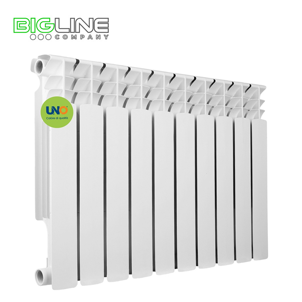 Радиаторы отопления UNO ТENTO 500/100 предназначены для применения в качестве отопительных приборов в системах водяного отопления жилых и общественных зданий. Радиаторы могут использоваться как для автономных систем отопления, так и для систем центрального отопления, в том числе многоэтажных высотных зданий. Каждая секция радиатора имеет два стальных горизонтальных коллектора, соединенных между собой вертикальной стальной трубкой. В целях повышения теплоотдачи, предварительно спаянные стальные трубки (стальной сердечник) сверху заливают алюминиевым сплавом методом литья под давлением в заранее приготовленные формы. Благодаря стальному сердечнику теплоноситель (вода, антифриз) не имеет контакта с алюминиевой поверхностью. Поэтому этот прибор более пригоден для применения в отопительных системах с плохим качеством теплоносителя (PH 810), что непозволительно для простых алюминиевых радиаторов.