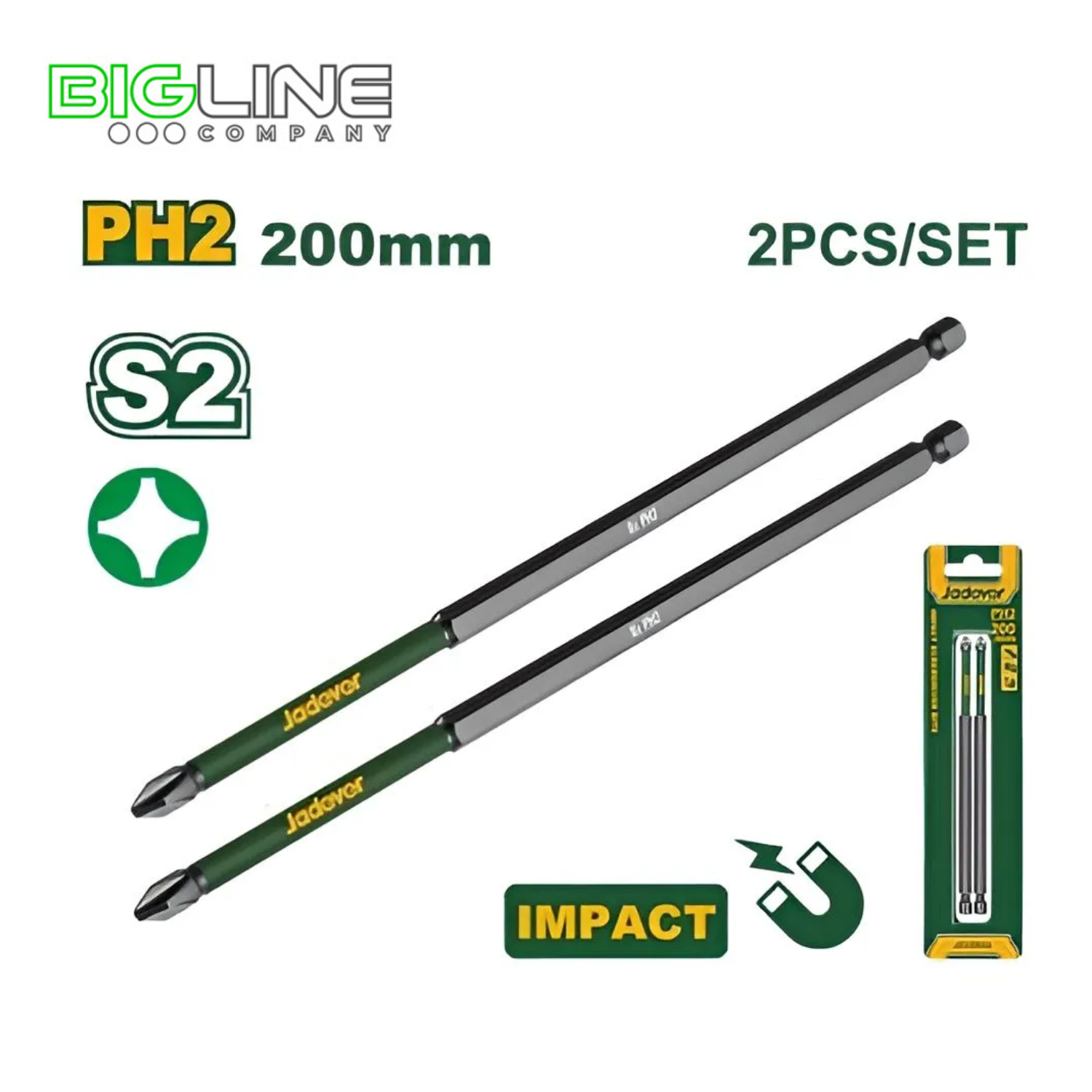 Биты кованные PH2×200мм, S2, 2шт. Jadever — профессиональный набор удлинённых бит для работы с шуруповёртами и дрелями.