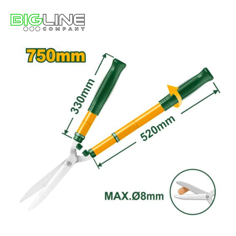 Подходит для точной подрезки веток, кустарников и живых изгородей. Телескопические рукоятки позволяют регулировать длину инструмента для работы на разной высоте и повышают удобство при длительном использовании.