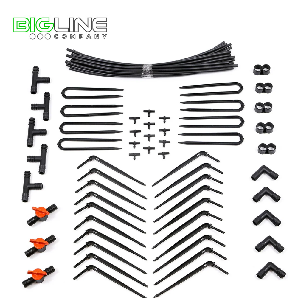 Комплектация: шланг подающий 40 см -20 шт, капельницы - 20 шт, тройник малый - 10 шт, кран - 3 шт, уголок для магистрального шланга - 5 шт, тройник большой - 5 шт, заглушка для магистрального шланга - 5шт, прижимы для магистрального шланга 8 шт.