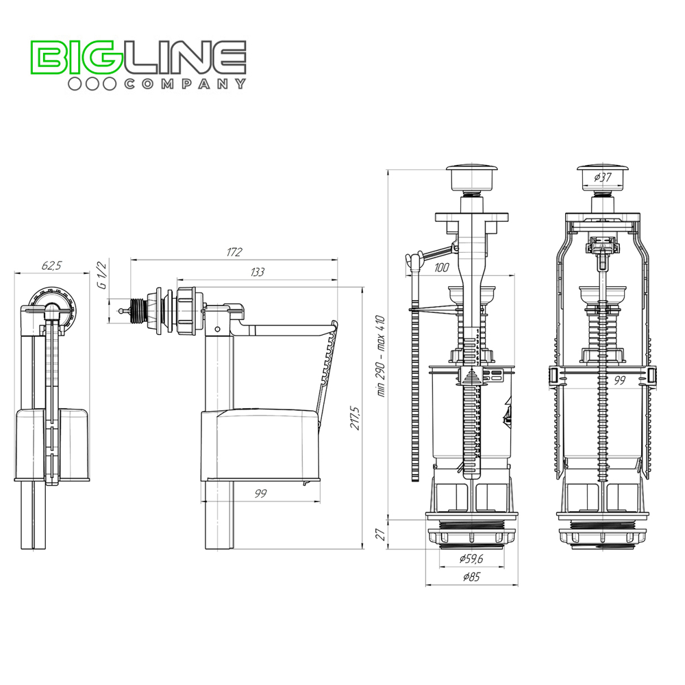 Набор для бачка унитаза. Наливной механизм с боковой подводкой и пластиковой резьбой диаметром 1/2. Сливной механизм металлизированная кнопка с одним экономичным режимом слива.
