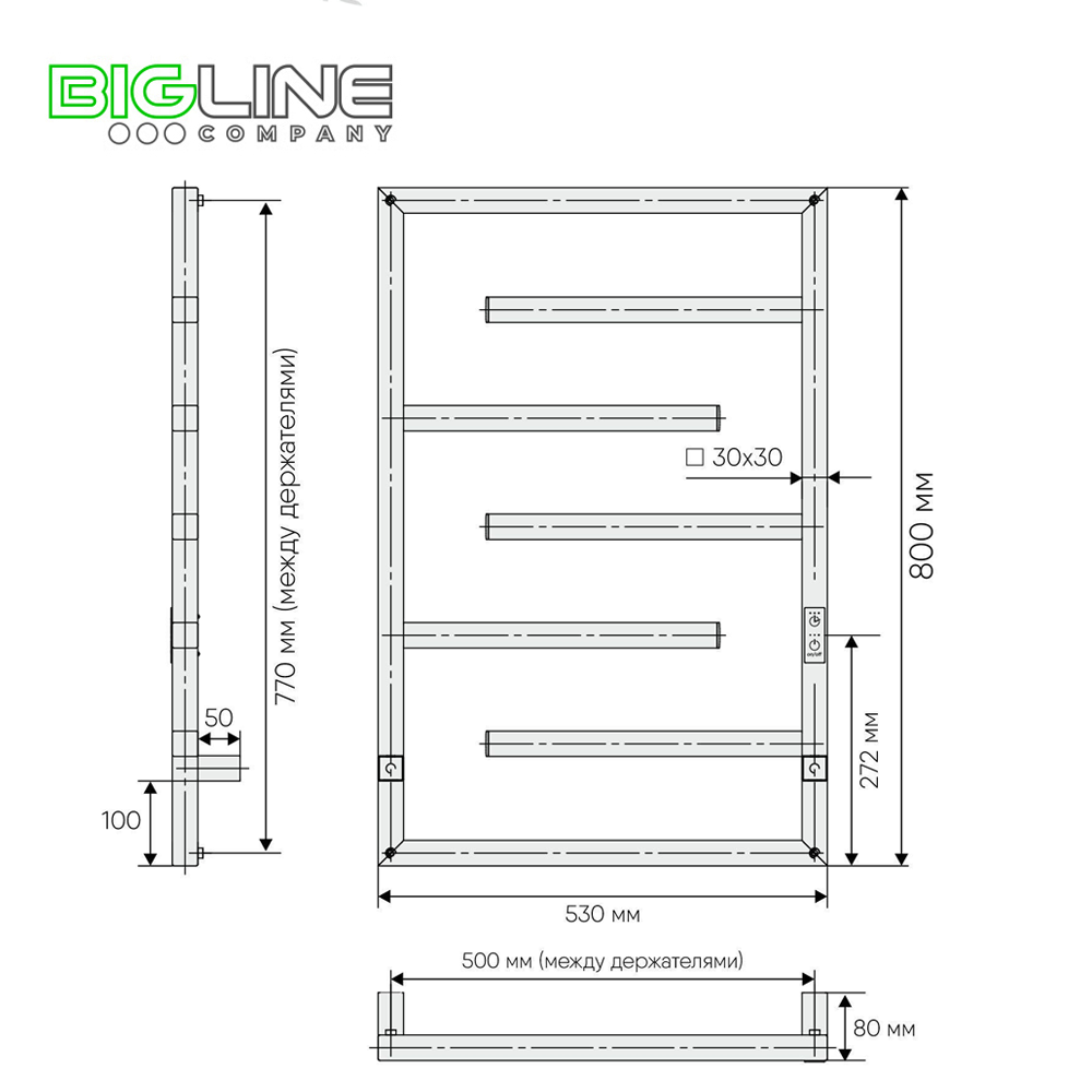 Полотенцесушитель электрический - 1 шт, паспорт изделия - 1 шт, комплект для монтажа - 1 шт, держатель телескопический - 4 шт.