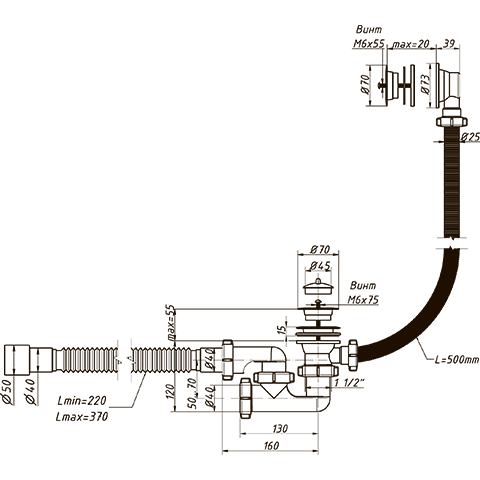 Сифон 1 1/2"х40, с переливом и пластиковыми решетками, для ванн и глубоких душевых поддонов. Конструкция сифона позволяет прочищать сифон, не демонтируя. В комплекте пробка. Отвод в канализацию гибкая труба 40 – 40/50.