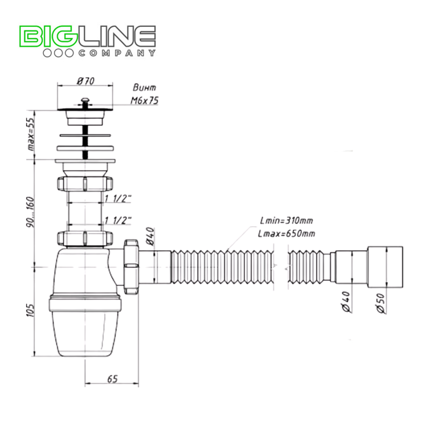 Сифон с большим корпусом и отстойником, выпуском с пластиковой чашкой д.70мм и гибкой трубой 40-40/50 для раковины или мойки.