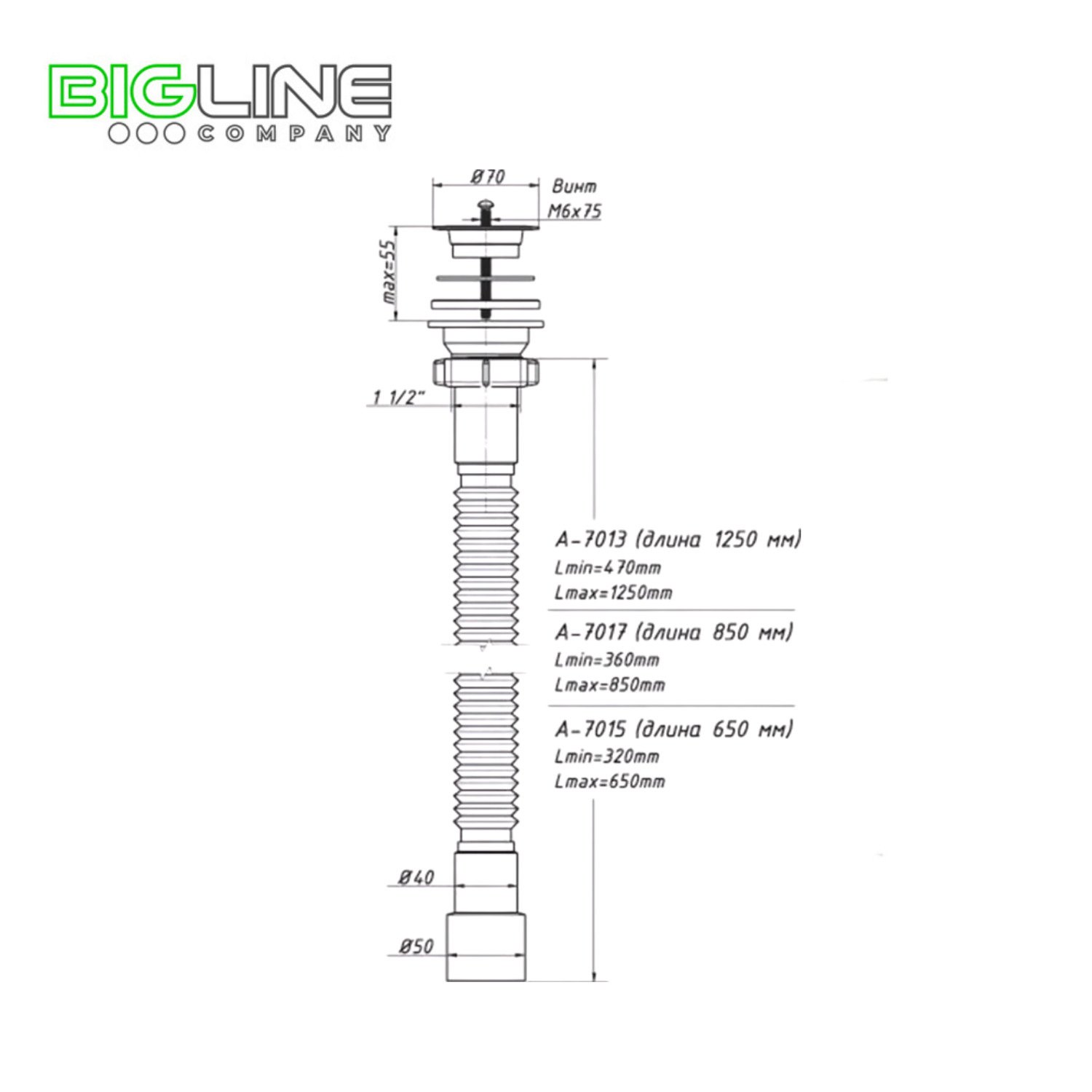 Гибкая труба 1 1/2"х40/50, с выпуском с пластиковой решёткой д.70мм и выходом в канализацию 40/50мм, для раковины и мойки. Длина гибкой трубы 470-1250мм.