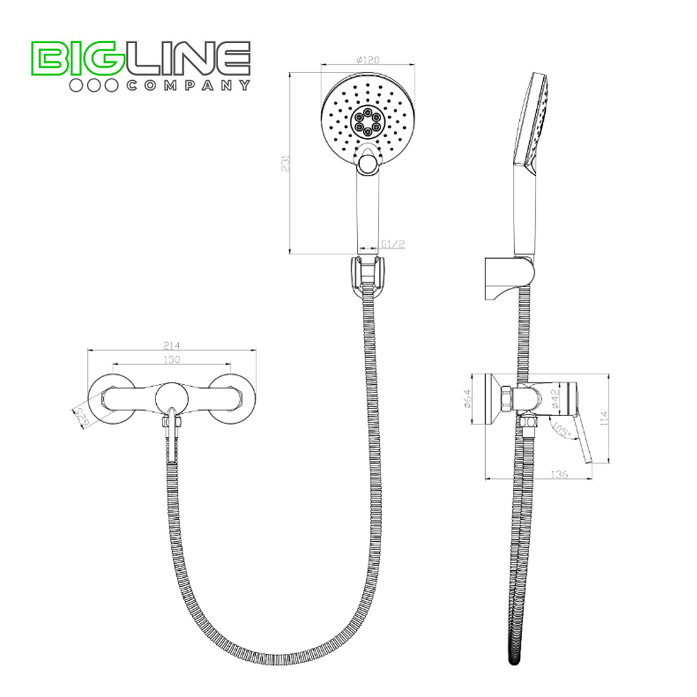 - aксессуары в комплекте: шланг 1,5 м 3-функциональная лейка Ø120x240 мм, настенное поворотное крепление для лейки