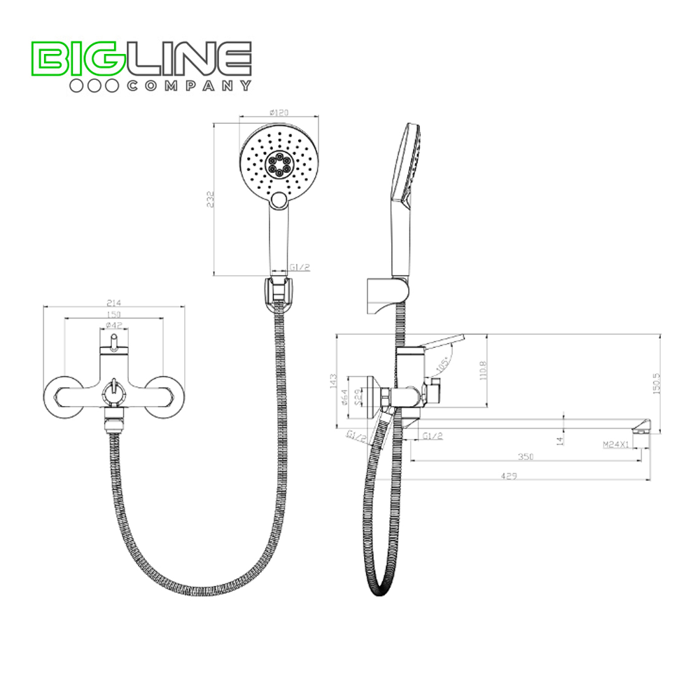- Аксессуары в комплекте: шланг 1,5 м, 3-функциональная лейка Ø120x240 мм, настенное поворотное крепление