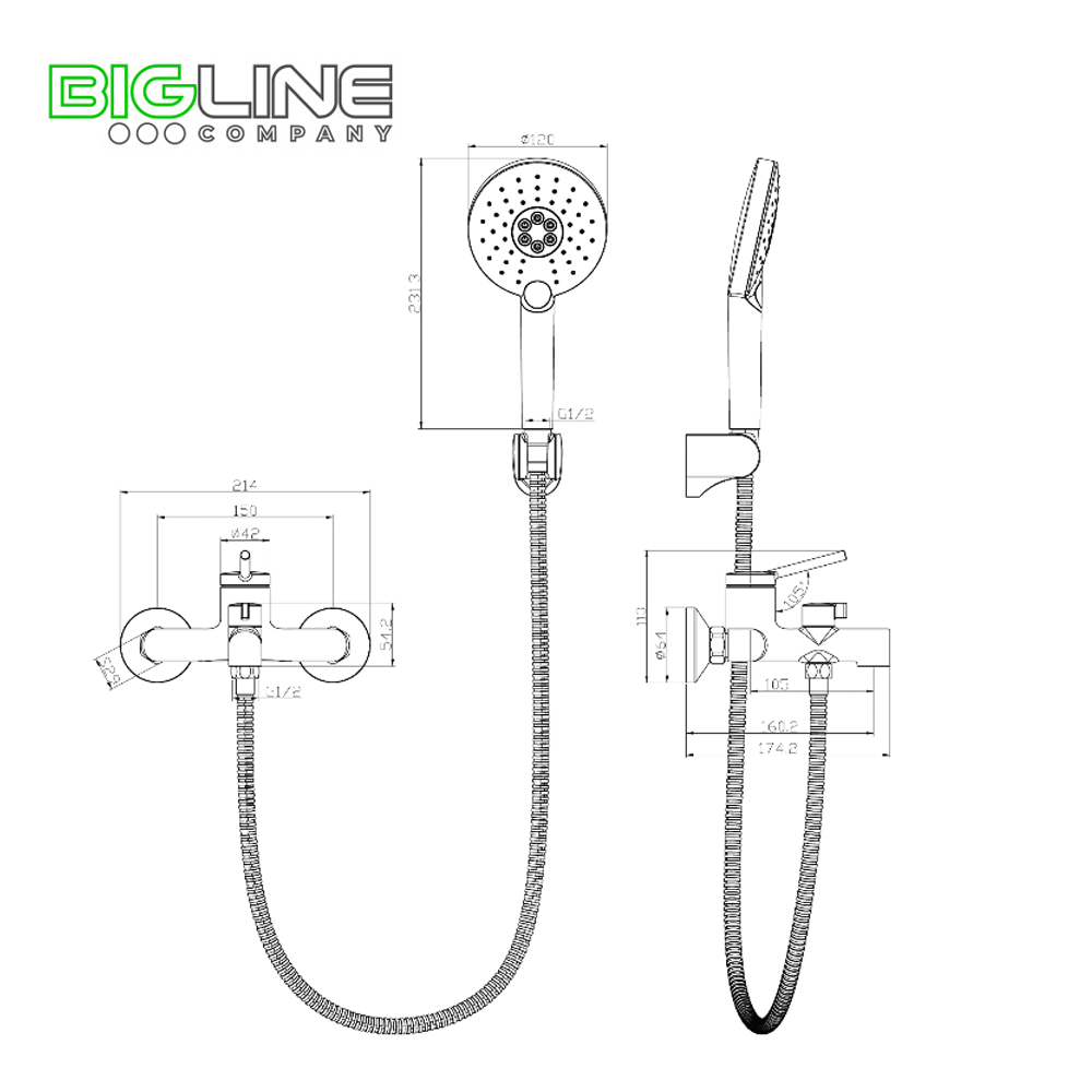 - Аксессуары в комплекте: шланг 1,5 м, 3-функциональная лейка Ø120x240 мм, настенное поворотное крепление для лейки