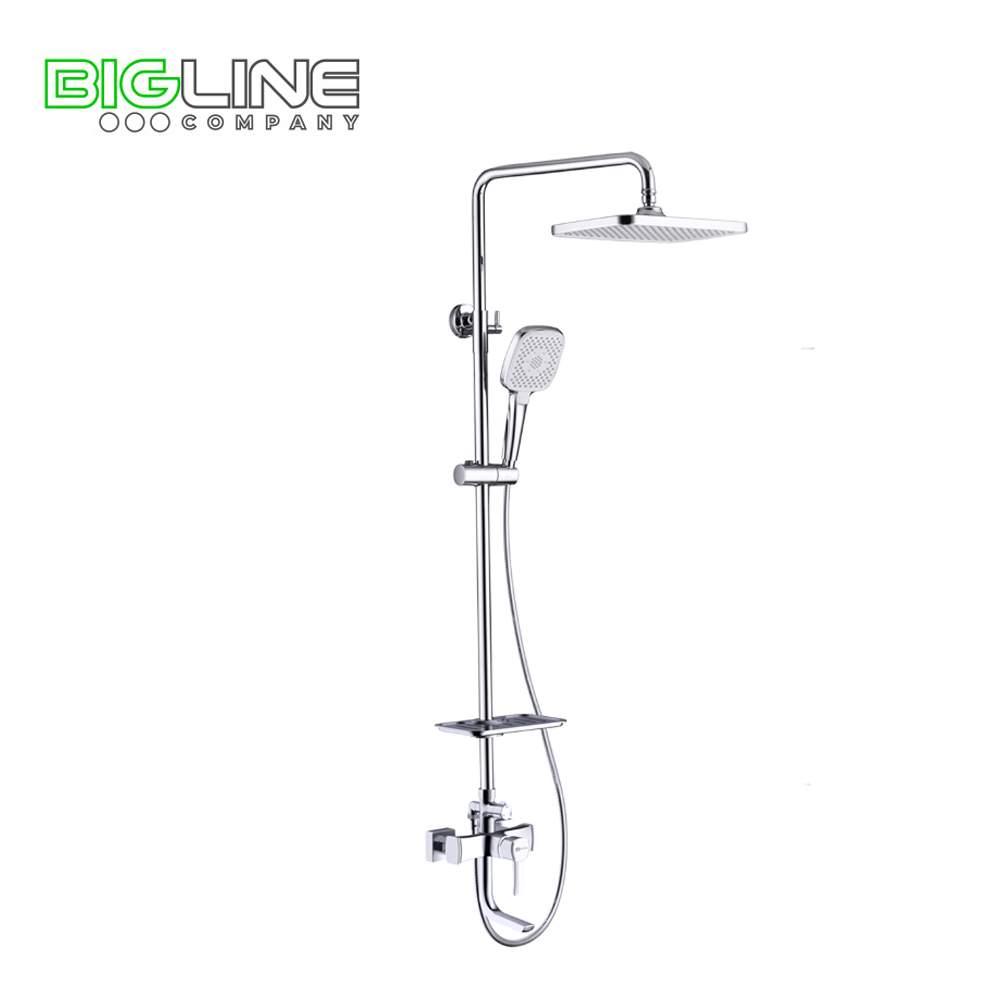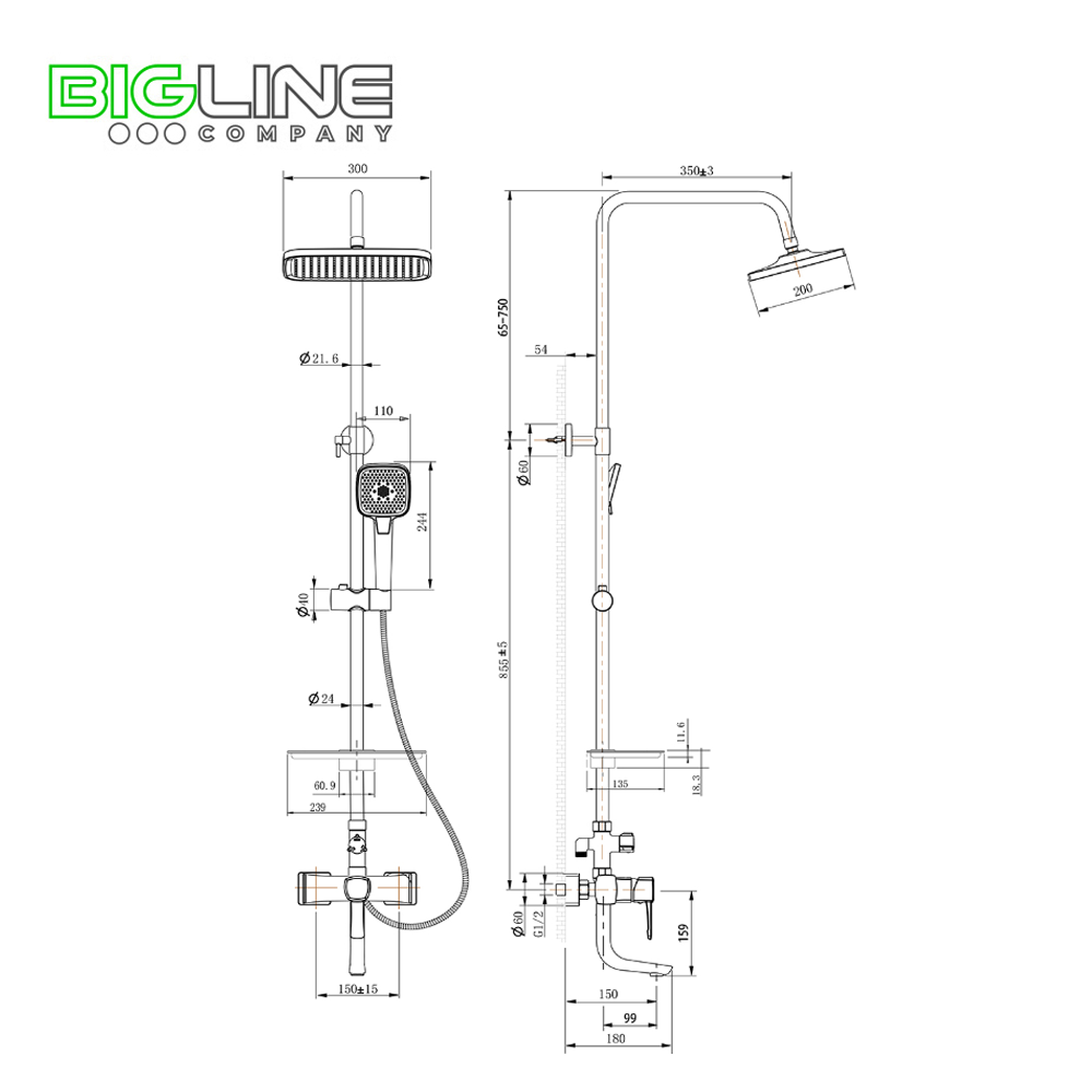 - Аксессуары в комплекте (верхняя душевая лейка «Тропический дождь» 200х300 мм, 3-функциональная лейка 110x258 мм, регулируемое по высоте крепление для лейки, полочка для душевых принадлежностей, душевой шланг 1,5 м)