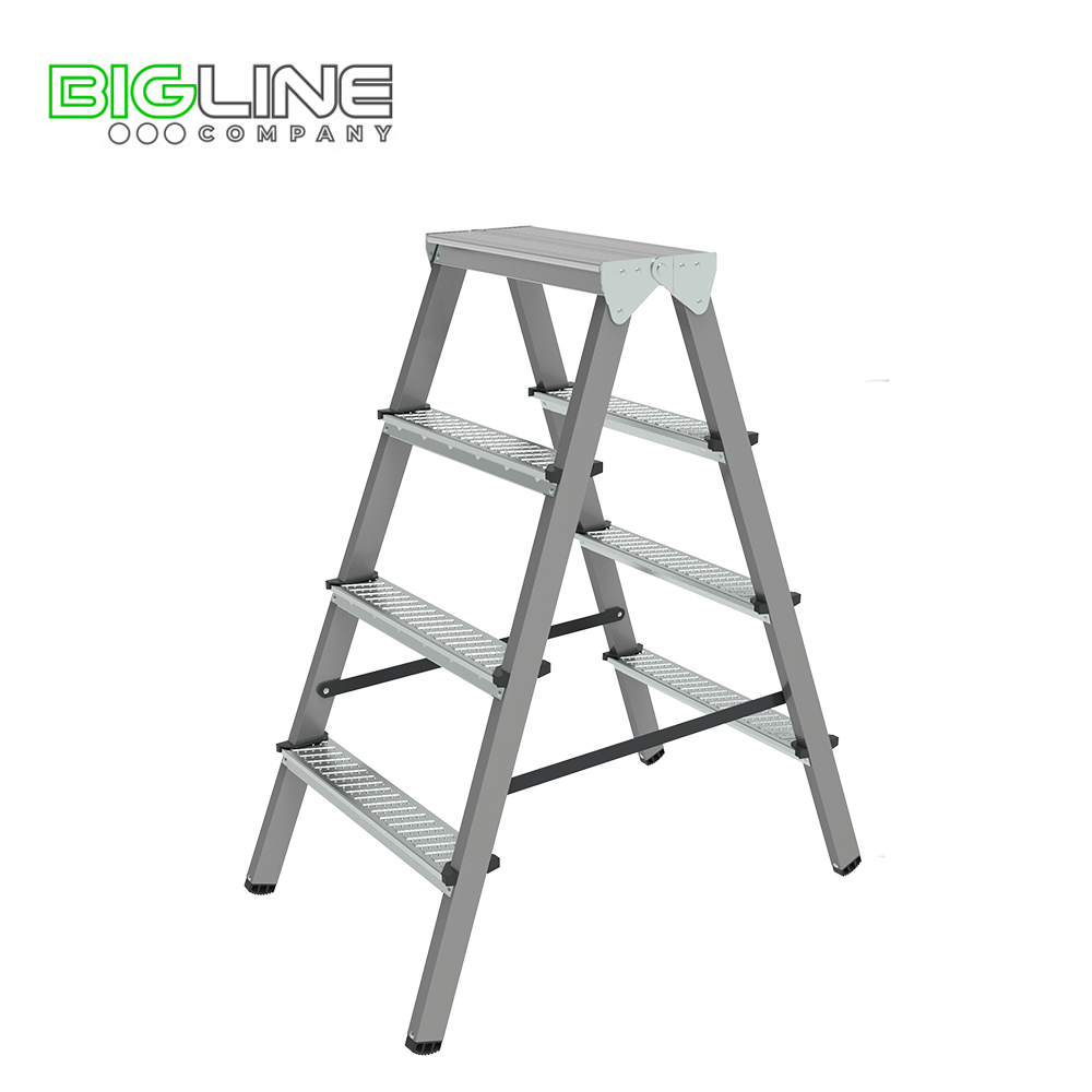 - Двусторонняя стремянка прочная и долговечная за счет стальной конструкции. Устойчива к механическим деформациям и прогибам.
