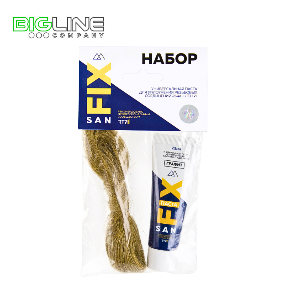 Нанесите лён на резьбу. Поверх равномерно распределите пасту SANFIX. Соедините элементы, обеспечив плотное скручивание. При необходимости допустима регулировка угла соединения до 30° без потери герметичности. Избегайте загрязнения пасты и храните её в плотно закрытой упаковке